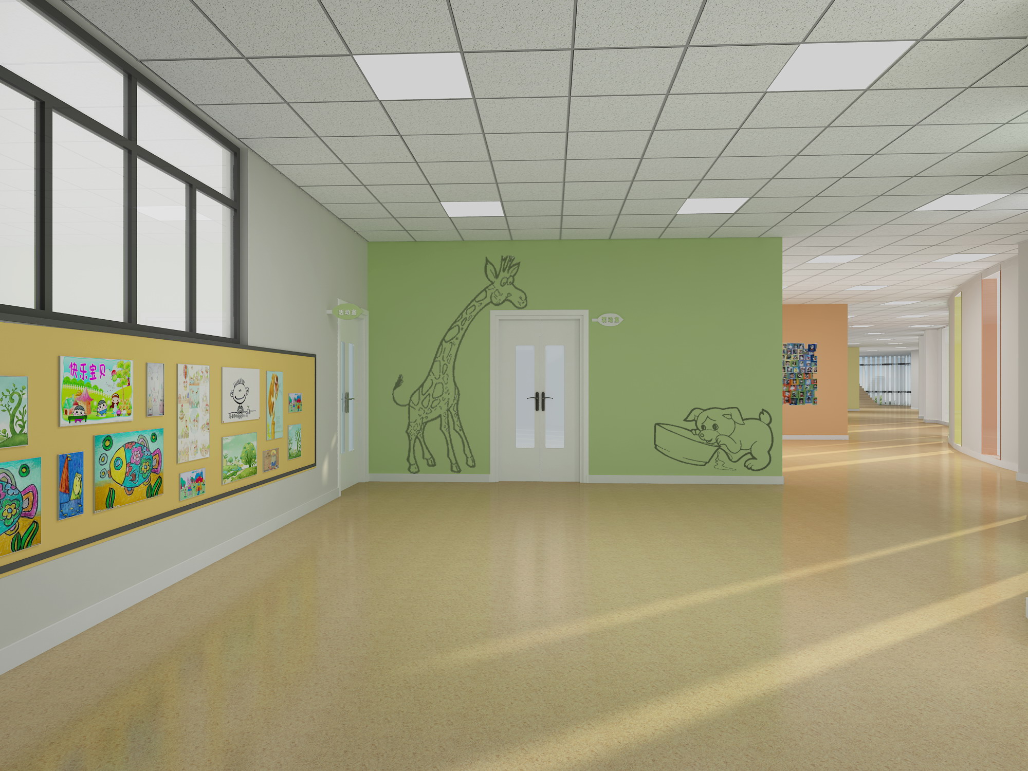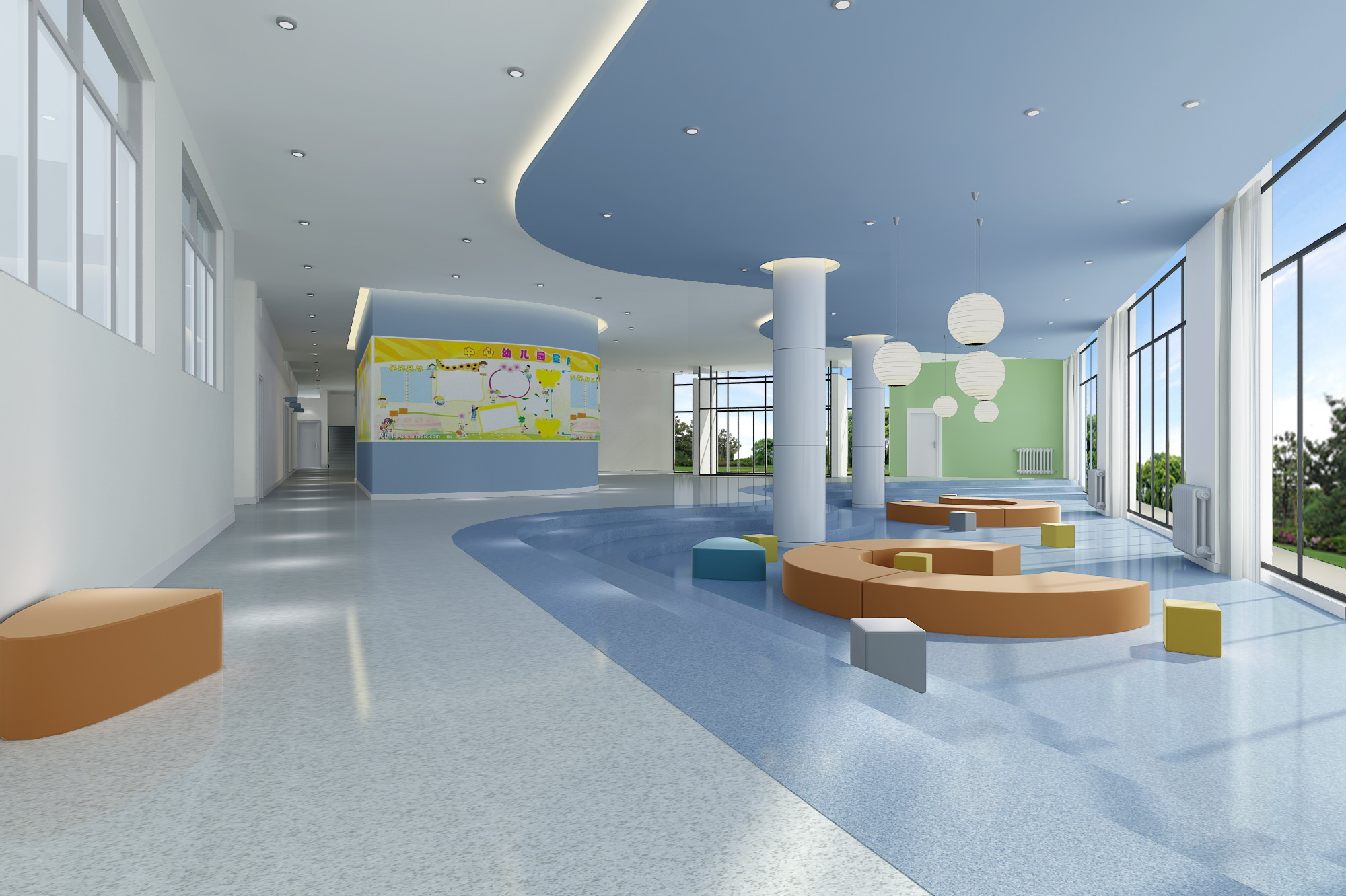 室內(nèi)設(shè)計(jì)從兒童生活的規(guī)律出發(fā),將空間劃分成單個(gè)或多個(gè)空間單元,有利于科學(xué)教育,方便保育和管理工作,整體布局合理,朝向適宜,分區(qū)明確。整體色調(diào)的使用則選用了藍(lán)、黃、綠、橙等暖色調(diào),消除了孩子們對陌生環(huán)境的恐懼感。