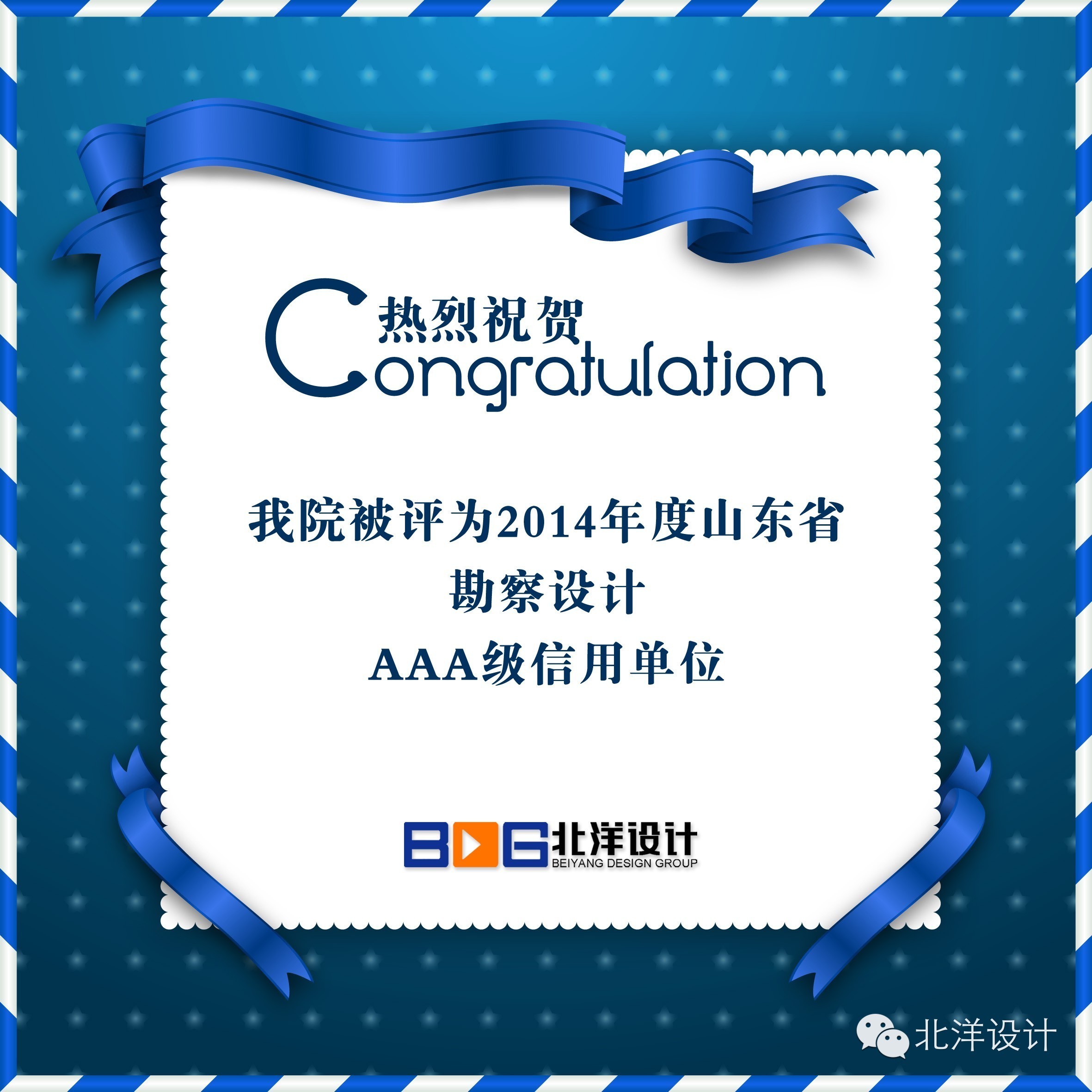 【北洋·喜報(bào)】祝賀我院被評(píng)為2014年度山東省勘察設(shè)計(jì)AAA級(jí)信用單位